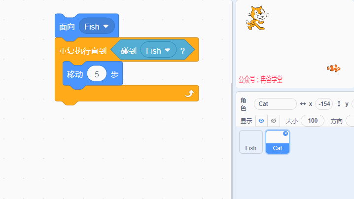 點擊代碼塊,即可看到右側舞臺上的動畫效果