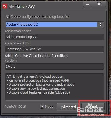 關(guān)閉PS cc2017后,打開Adobe CC 2017\amtemu.v0.9.1.win-painter下的amtemu.v0.9.1-painter按照下面的操作步驟即可。注意:第4步選取C:\Program Files\Adobe\Adobe Photoshop CC 2017\amtlib.dll 打開確定即可