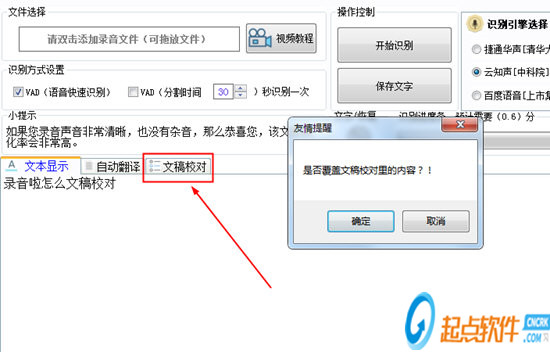 1、既然是要進行錄音文稿的校對,當然是需要先將錄音轉(zhuǎn)換為文字啦,直接在上方的功能欄目中找到“錄音轉(zhuǎn)文字”功能選項,進入之后就可以將錄音文件雙擊添加或拖動到紅框內(nèi),接著點擊其中你的“開始識別”選項2、在識別完成之后,大家可以在下方的文本顯示中看到錄音文件經(jīng)過識別后顯示的文本, 當你需要校對文稿時,只需要點擊其中的“文稿校對”功能即可,如果你之前文稿校對里已經(jīng)有內(nèi)容,將會彈出是否覆蓋的提示,這里默認選擇“確定”選項