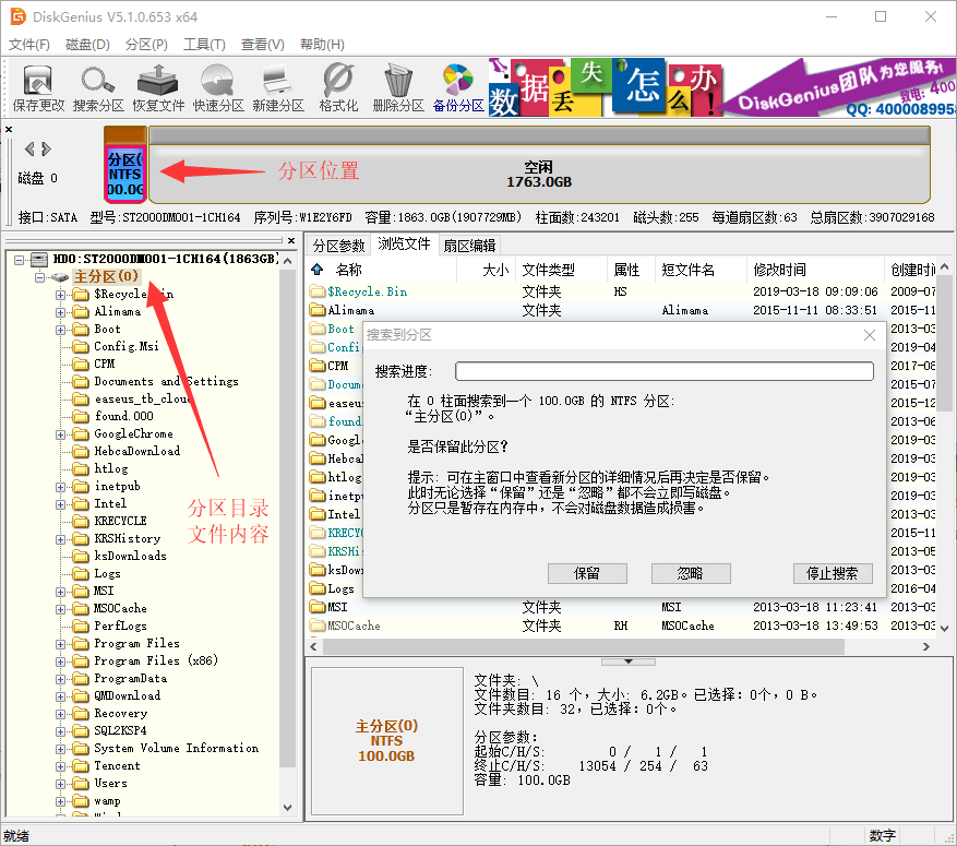 用戶可以根據(jù)該分區(qū)的位置、大小及在主窗口中顯示的目錄文件信息,判斷該分區(qū)是否為自己要恢復的分區(qū)、是否保留該分區(qū)。