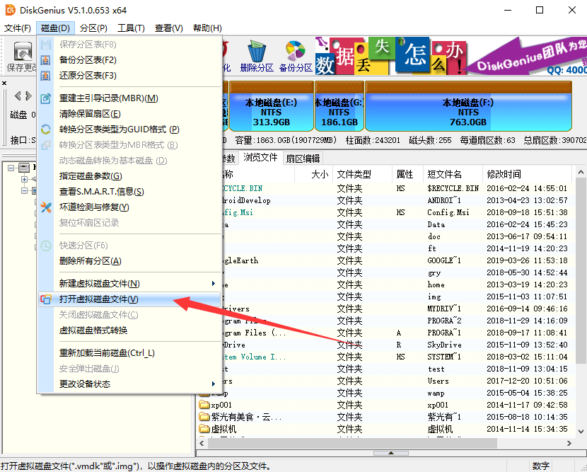 運行DiskGenius后,主菜單選擇:磁盤 > 打開虛擬磁盤文件,如下圖所示: