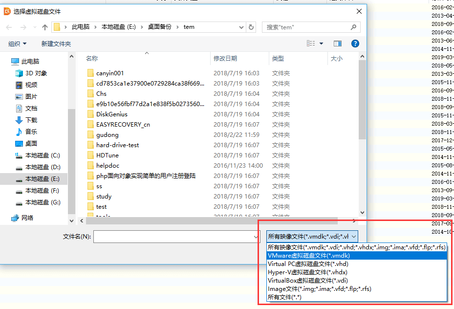 在彈出的打開文件對話框中,可以看到,DiskGenius支持幾乎所有格式的虛擬硬盤格式,除了常用的VmWare、Virtual PC與VirtualBox格式,一些不常用的虛擬硬盤格式也都被DiskGenius所支持,如下圖所示:
