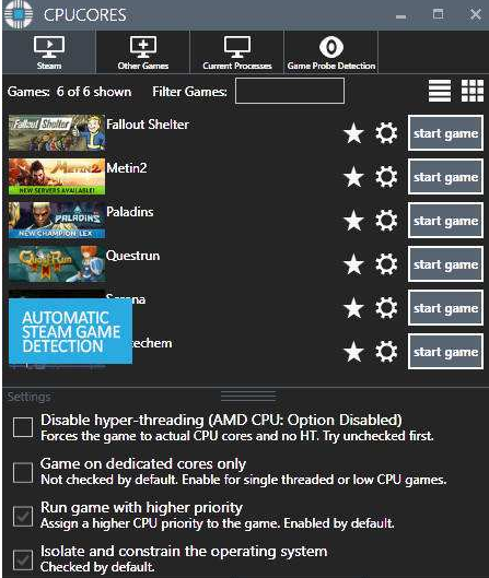 cpucores分離為處理核心,是專門用于您的游戲。此外,cpucores將允許游戲特有的超線程禁用/啟用。此外,高級選項允許你在處理核心和/或超線程,你希望你的游戲使用的是特定的(或不使用)。