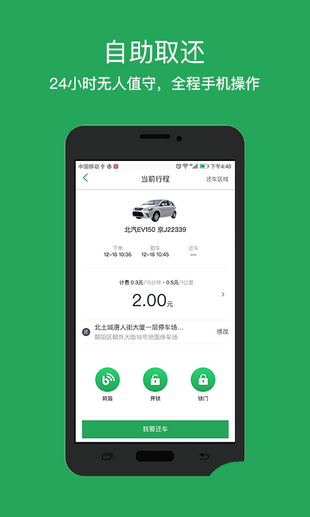 簡單的使用方式、開鎖、關(guān)門還車全都通過app進行操作。
