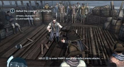 之后海爾森為了探尋徽章的秘密,準備來到處于烽火邊緣的新大陸來發(fā)掘真相。下面切換到前往新大陸的船上,首先來到甲板;進行近戰(zhàn)格斗的練習。按手柄B則是躲避敵人的攻擊,而在躲避敵人攻擊之后繼續(xù)按A則是對于敵人武器進行繳械