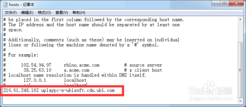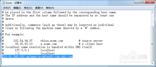 我們將hosts文件加入210.61.248.162 uplaypc-s-ubisoft.cdn.ubi.com這句話(huà),或者也可以直接復(fù)制以下內(nèi)容到hosts進(jìn)行覆蓋(別忘備份hosts);詳情參考下圖