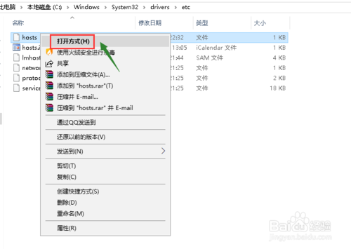 右鍵hosts文件,選擇打開(kāi)方式,如下圖所示