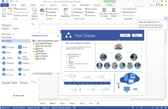空白繪圖頁(yè)的上方是Microsoft Office功能區(qū),其中包含用于繪制圖表的命令和工具。如果只看到了選項(xiàng)卡名稱而看不到任何按鈕,請(qǐng)單擊某一選項(xiàng)卡名稱可在該選項(xiàng)卡處臨時(shí)打開功能區(qū)。