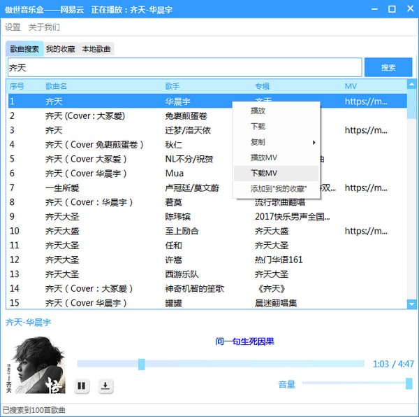 3、支持播放和下載歌曲、MV[暫不支持下載付費音樂]