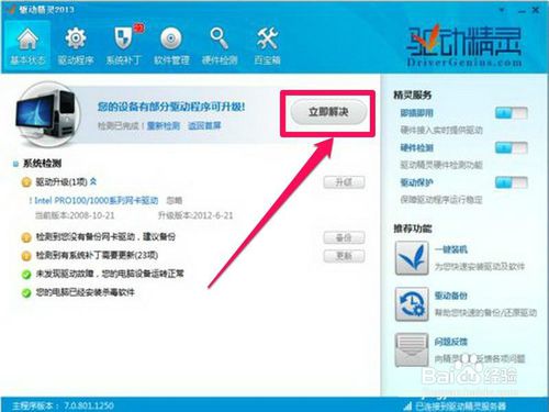 2,等它檢測出來后,如果有驅(qū)動程序損壞,會自會提示要更新的驅(qū)動程序,按“立即解決”就可以了。