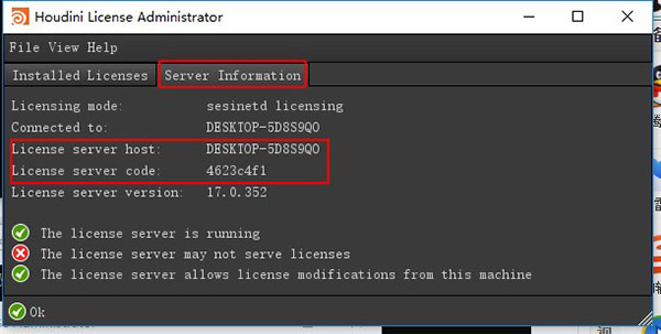 5、在Houdini License Administrator界面的Server information欄下找到License server host和License server code對應(yīng)信息;