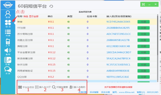 一、60碼短信平臺怎么收發(fā)碼驗證碼?首先選擇點擊項目,平臺項目是60碼官方項目,基本可以滿足大部分客戶項目需求。找到要做的項目點擊收藏。