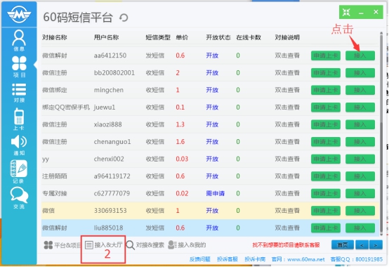 1、首先在項目列表里找到要去代理的項目,點擊接入,這里舉例60碼官方的微信注冊項目。