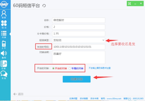 短信收發(fā)平臺,它增加的全新的對接模式 并且將對接分為多種類型 且支持傳統(tǒng)的項目模式1.傳統(tǒng)模式對接:用戶與卡商協(xié)商號,創(chuàng)建對接單獨使用
