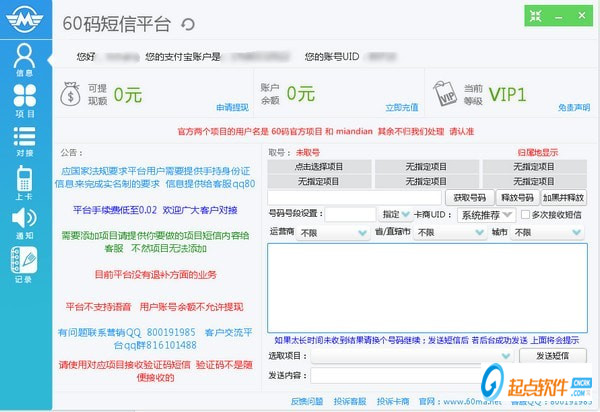 60碼短信平臺是一款功能非常強大的短信平臺,內置海量虛擬手機號碼,可以幫助用戶輕松完成各種小號的注冊,省去了單獨購買手機卡的繁瑣步驟。60碼短信平臺界面簡約,左側是功能選擇區(qū),右側是實現(xiàn)區(qū),使用起來非常的簡單,上手很容易。和一般平臺不同的是,60碼短信平臺短信平臺卡類眾多,國內、美國卡、柬埔寨等應有盡有,可以更好的滿足用戶的多樣化需求,真正做到與國際接軌。
