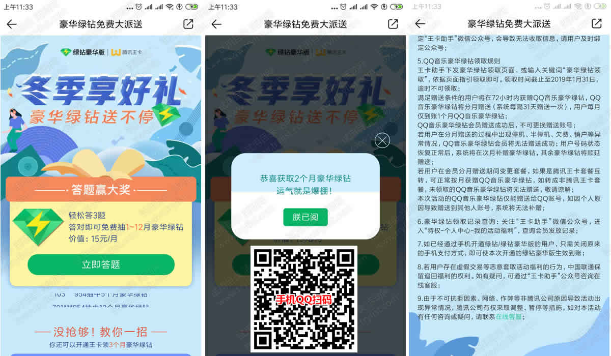 QQ音樂 冬季享好禮 答題領(lǐng)1~12個月豪華綠鉆;騰訊王卡和QQ音樂的合作活動