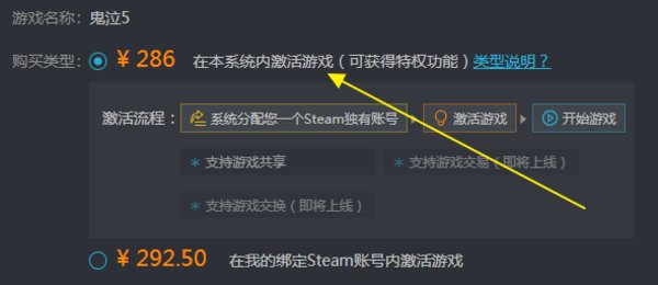 購買游戲時(shí)對(duì)“本系統(tǒng)內(nèi)激活”和“充值到Steam賬號(hào)”做了更清晰的說明