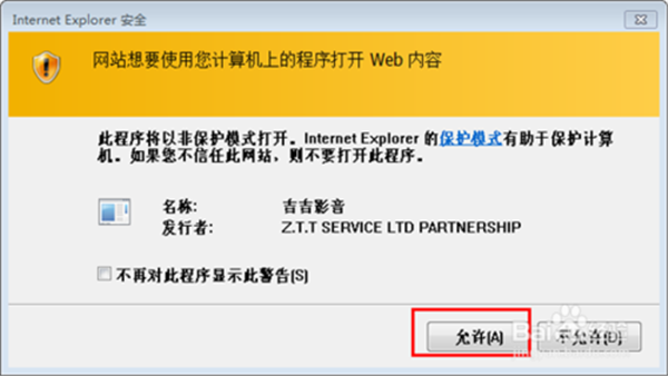 出現(xiàn)的吉吉影音插件一定要設(shè)置允許,并且勾選不再對此程序提醒警告。