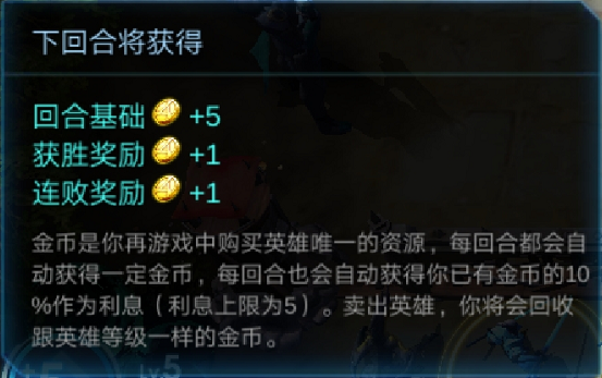 在游戲中,金幣主要有兩個來源。一是每回合的收入,每回合的收入=回合基礎(chǔ)收入+利息收入+連勝獎勵/連敗補償。利息收入即你結(jié)束回合時的金幣的10%。利息收入最高為5,所以當(dāng)你的金幣囤積超過50后,盡量把這些富余的金幣轉(zhuǎn)化為你的棋子。