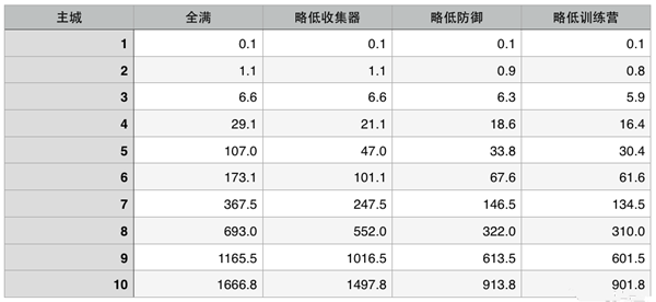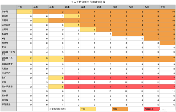 首先,如果你想知道需要多久能夠完成全部的建筑,以下是每級(jí)主城滿防滿建筑所需的工人天數(shù)。(并不包括英雄和各種陷阱)
