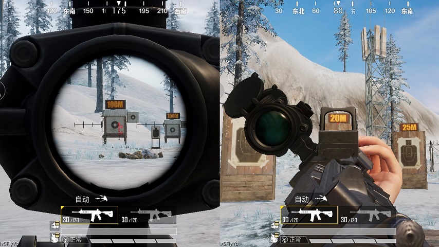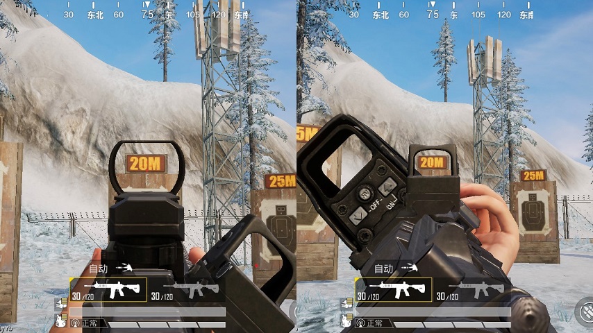 我們再看到中遠距離的倍鏡,在裝備了3倍鏡和4倍鏡的M416后,同樣的距離開鏡效果差別不是特別大,所以小編把它們放在一起和側(cè)瞄準鏡做搭配對比。從對比圖中可以發(fā)現(xiàn),側(cè)瞄準鏡不管是在20米或是100米上,在視野上對這兩種倍鏡的幫助都不大,近的不如它們看得全,稍遠點的又不如它們看得清。但是這種中遠倍鏡雖然視野方面的能力相對比較全面,在攻擊移動對手和移動車輛上面的能力卻遠遠不如側(cè)瞄準鏡這種近距離倍鏡來的順暢,二者如果搭配起來可以算得上錦上添花了。