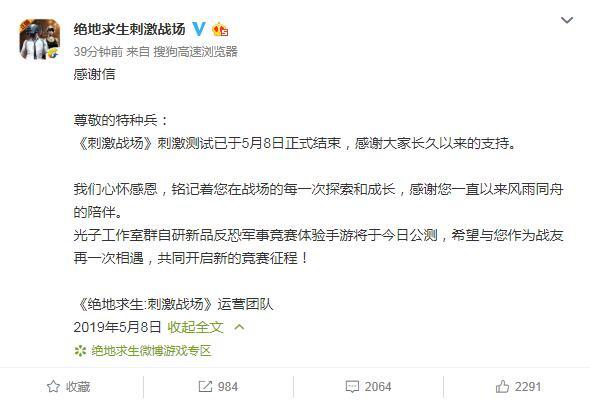刺激戰(zhàn)場測試結(jié)束官方微博宣稱《刺激戰(zhàn)場》刺激測試已經(jīng)于2019年的5月8號正式結(jié)束了。
