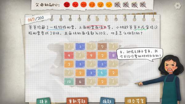 這游戲真的有點難。。。也許這會是讓你能經(jīng)歷絕望的一款游戲,因為你沒辦法正確的解出游戲中的題目,就會感受到來自父母無盡的嘲諷,而這個過程中可能會產(chǎn)生焦慮、暴躁等癥狀,甚至會開始懷疑智商。。。但真相并非是惡意去折騰玩家們,制作團隊希望能通過游戲這種方式,與現(xiàn)實產(chǎn)生情感共鳴,讓玩家能體會中國家長在輔導孩子作業(yè)時產(chǎn)生的崩潰感覺,同時更能理解作為孩子做不出題時的無助心情,總之不要因為解不出小學生數(shù)學題而產(chǎn)生打我們的想法就好。