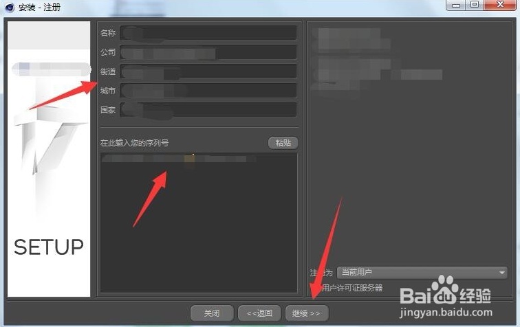 安裝第三步:注冊,填寫名稱、公司、街道、城市和國家,然后將序列號復(fù)制進(jìn)去并點(diǎn)擊繼續(xù)。