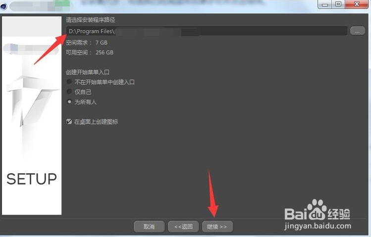 安裝第七步:更改安裝路徑首字母C為D,安裝到系統(tǒng)盤符的D盤以節(jié)省C盤系統(tǒng)盤空間,然后勾選在桌面創(chuàng)建圖標(biāo),并點(diǎn)擊繼續(xù)。