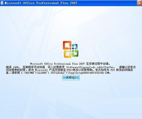 狀況二:我們在安裝office2007的時候,會出現(xiàn)以下信息,錯誤1406,安裝程序無法將值寫入注冊表項,需要聯(lián)系管理員權(quán)限,導致無法安裝。