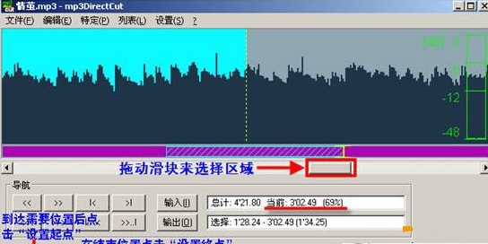 現在就可以正式開始剪切工作了。例如我想要將《情繭》中的一段剪切下來作為鈴聲,具體操作如下:
