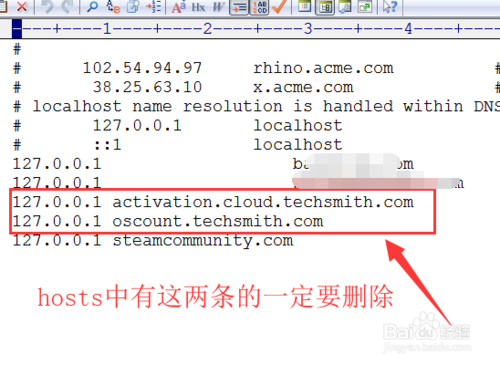 2、然后可以使用Editplus之類的文本編輯器打開hosts文件.如果看到如下圖所示techsmith信息,一定要刪除掉它,否則會失敗,我本人就是第一次安裝注冊的時候就是沒有刪除它們,才激活失敗的(激活失敗的話,在你使用Camtasia分享視頻,生成視頻的時候,會有提示在試用中)。