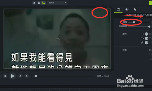 6、第二種方法就是調(diào)整編輯框內(nèi)視頻的大小,讓視頻中有水印的一部分不在編輯框內(nèi)出現(xiàn)就可以了,當(dāng)然這種方法最好是在視頻比較清晰的情況下使用,如果視頻比較模糊的話在把視頻進(jìn)行放大就會更加不清晰了。在右側(cè)有視頻的屬性編輯框,其中有一個縮放選項(xiàng),我們可以通過鼠標(biāo)來滑動上面的軸標(biāo),達(dá)到視頻的縮放效果。我們在這里把視頻放大,使有水印的部分不再編輯框內(nèi)出現(xiàn)。