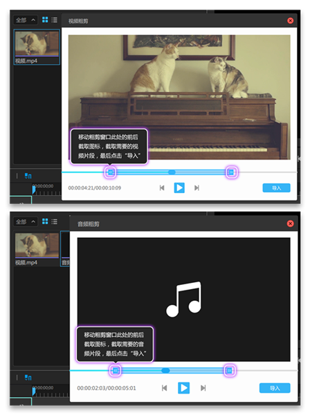 2、在視頻,音頻的粗剪窗口中,移動粗剪窗口中的前后截取圖標,截取需要的視音頻片段,對視頻或音頻進行一定范圍的粗略剪輯,最后點擊“導(dǎo)入”,如圖所示: