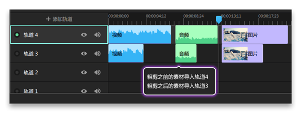 4、如圖4所示,粗剪之前的素材導(dǎo)入軌道4,粗剪之后的素材導(dǎo)入軌道3,素材在素材庫中粗剪,導(dǎo)入時間軸軌道的是粗剪后的素材,即在素材庫中粗剪后的素材會覆蓋原始素材,但不影響已經(jīng)導(dǎo)入軌道的素材。