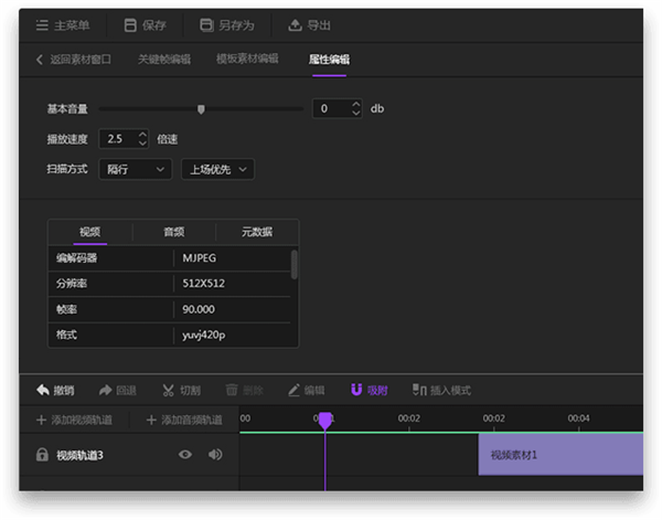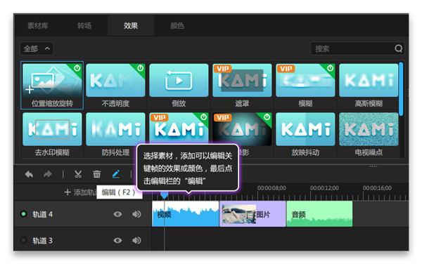 2、選擇素材,添加可以編輯關(guān)鍵幀的效果或顏色,然后選擇軌道的素材,點擊編輯欄的“編輯”,來到關(guān)鍵幀編輯面板,在關(guān)鍵幀編輯面板中編輯效果或顏色的關(guān)鍵幀,拖動該圖標,可縮放關(guān)鍵幀編輯面板。