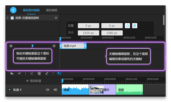 3、接下來講講詳細使用關(guān)鍵幀的步驟,需要使用效果或顏色的某些參數(shù)的關(guān)鍵幀時,首先要在模板素材編輯面板中,點擊參數(shù)旁邊的“添加關(guān)鍵幀”按鈕,接下來可在關(guān)鍵幀編輯面板中,編輯某些參數(shù)的關(guān)鍵幀。