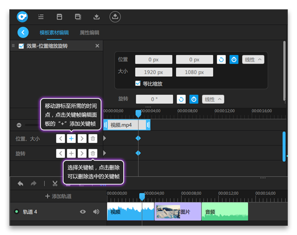 4、移動游標至所需的時間點,點擊關(guān)鍵幀編輯面板的“+”,添加關(guān)鍵幀;選中關(guān)鍵幀,點擊刪除,可以刪除選擇的關(guān)鍵幀;點擊上一個關(guān)鍵幀,或者下一個關(guān)鍵幀,可在當前的時間位置,跳轉(zhuǎn)到上一個關(guān)鍵幀或者下一個關(guān)鍵幀。