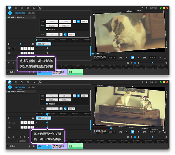 5、調(diào)節(jié)關(guān)鍵幀對應(yīng)的參數(shù),選擇關(guān)鍵幀編輯面板的某個關(guān)鍵幀,關(guān)鍵幀為藍色,表示被選中狀態(tài),灰色為未被選中狀態(tài),調(diào)節(jié)選中關(guān)鍵幀對應(yīng)的模板素材編輯面板的參數(shù),再次選擇另外的關(guān)鍵幀調(diào)節(jié)參數(shù),在兩個關(guān)鍵幀之間運動或變化,電腦會自動生成這些運動或變化。