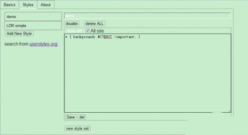 2.用戶還可以設(shè)置背景顏色: 工具->擴(kuò)展程序找到Stylist 點(diǎn)選項(xiàng)進(jìn)行設(shè)置 如下圖所示點(diǎn)Styles--demo---選擇All site 再把這段代碼粘貼在下面就行了 * { background: #C7EDCC !important; }