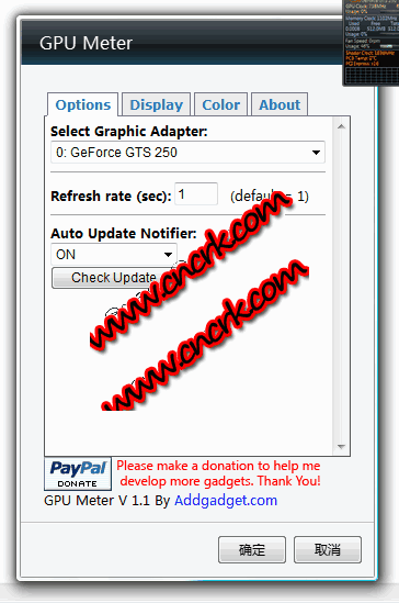 gpu meter是用來監(jiān)視顯卡運行狀態(tài)的桌面小工具,它可以顯示廠商、型號、gpu時鐘速率、溫度、顯存、風扇等的運行情況。