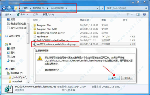 SolidWorks2019怎么破解?1、下載SolidWorks2019破解版安裝包壓縮包,解壓SolidSQUAD_壓縮包,將“_SolidSQUAD_”破解文件復(fù)制到C盤目錄下,復(fù)制完畢后,雙擊運(yùn)行“sw2019_network_serials_licensing.reg”導(dǎo)入注冊(cè)表信息,彈出界面點(diǎn)擊“是”即可。