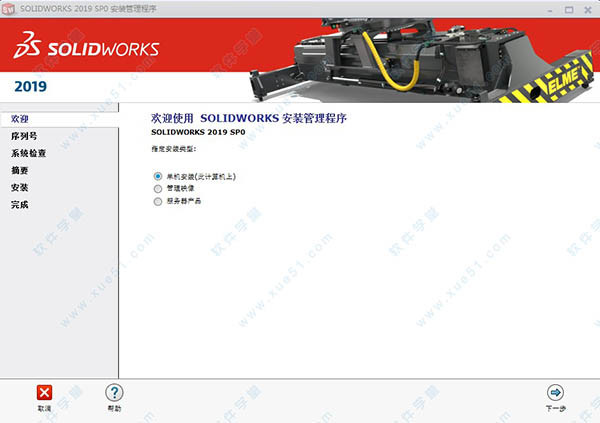 4、斷開正在連接的網(wǎng)絡(luò),然后解壓安裝文件“SolidWorks.2019.SP0.Full.Premium.DVD.iso”壓縮包,雙擊運(yùn)行“setup.exe”啟動(dòng)安裝程序進(jìn)行軟件原版安裝,彈出界面,選擇“單機(jī)安裝”。