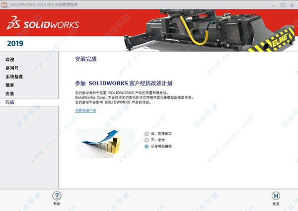 8、SolidWorks2019安裝完成,點(diǎn)擊“完成”退出安裝程序。