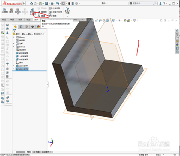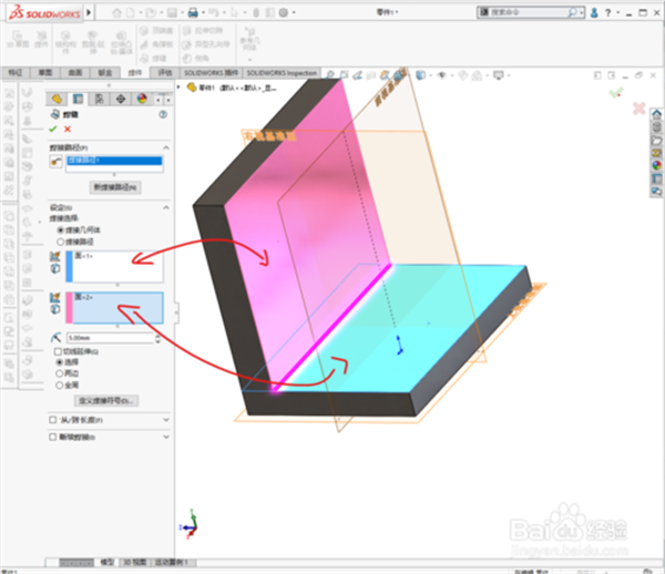 6、選擇兩個(gè)平面,及焊接面。如果是選擇的焊接路徑,則選著兩個(gè)面的交線。