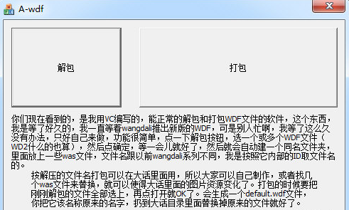 請使用時仔細閱讀程序的說明。另外,該程序在提取較大的wdf文件的時候會出現電腦遲鈍,并非死機,請稍等一會。對游戲文件中的以wd1,wd2這樣結尾的文件,把他們的后綴改為wdf即可使用此軟件提取。提取出來的東西都以was為結尾,大部分是動畫,少部分是音樂和圖片。你可以使用我們提供下載的Glowtools系列工具中的waskey.exe程序查看動畫類,而對于圖片和音樂類的,你可以嘗試將was后綴修改為tga,mp3或者mid進行查看。先用A-wdf解壓程序把.wdf格式文件解壓出來再用Glowtools里的對應程序來查看,方便修改。