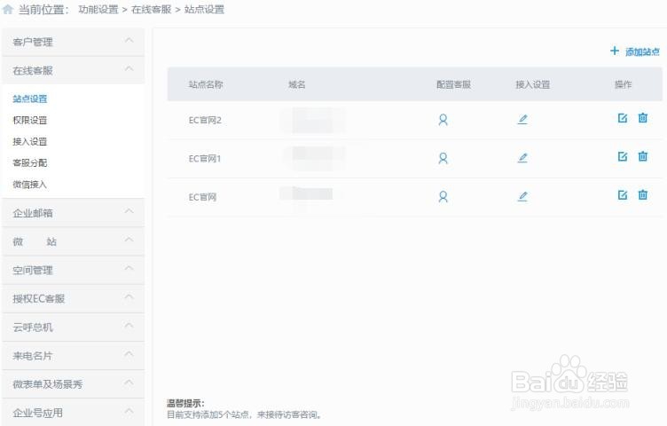 點擊“添加站點”即可,命名可以輸入16個字符,最多可以綁定10個不同的域名,綁定后只接收該站點下的訪客咨詢!