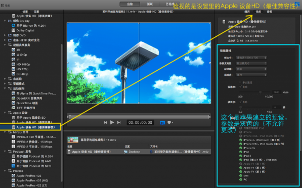 ①、拖入一個(gè)視頻,并添加預(yù)置,這里以Apple設(shè)備(最佳兼容性)導(dǎo)出到桌面為例。