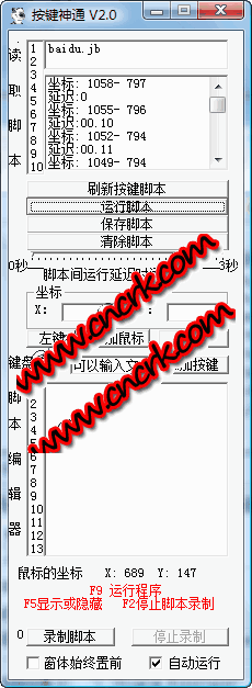 按鍵神通 V2.0 簡(jiǎn)體中文綠色免費(fèi)版 按鍵神通可以幫您操作電腦,支持動(dòng)作錄制和回放功能。不需要任何編程知識(shí)就可以做出功能強(qiáng)大的腳本。只要您在電腦前用雙手可以完成的動(dòng)作,按鍵神通都可以替您完成。按鍵神通內(nèi)置上百個(gè)命令,提供全界面化的操作。腳本還可以生成獨(dú)立的小精靈軟件,發(fā)給朋友分享。放飛您的雙手,點(diǎn)亮您的創(chuàng)意,自己做軟件,也可以如此簡(jiǎn)單!