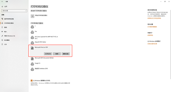 按下快捷鍵“Win+I”,打開Windows設(shè)置,點(diǎn)擊設(shè)備,進(jìn)入打印機(jī)和掃描儀選項(xiàng),選中MicrosoftPrinttoPDF打印機(jī)(該打印機(jī)Windows系統(tǒng)一般有自帶)